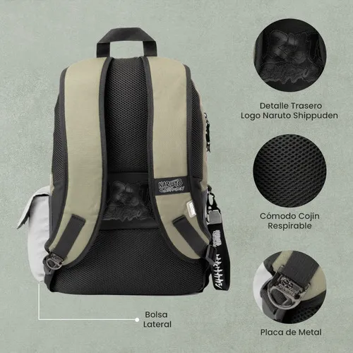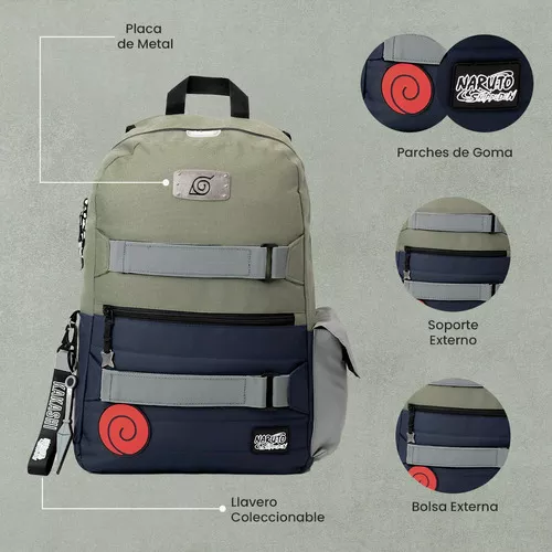 Los elementos distintivos que no te puedes perder son… sus cierres en forma de shuriken, el llavero coleccionable en forma de kunai, parches de goma y la placa metalica de Konoha.